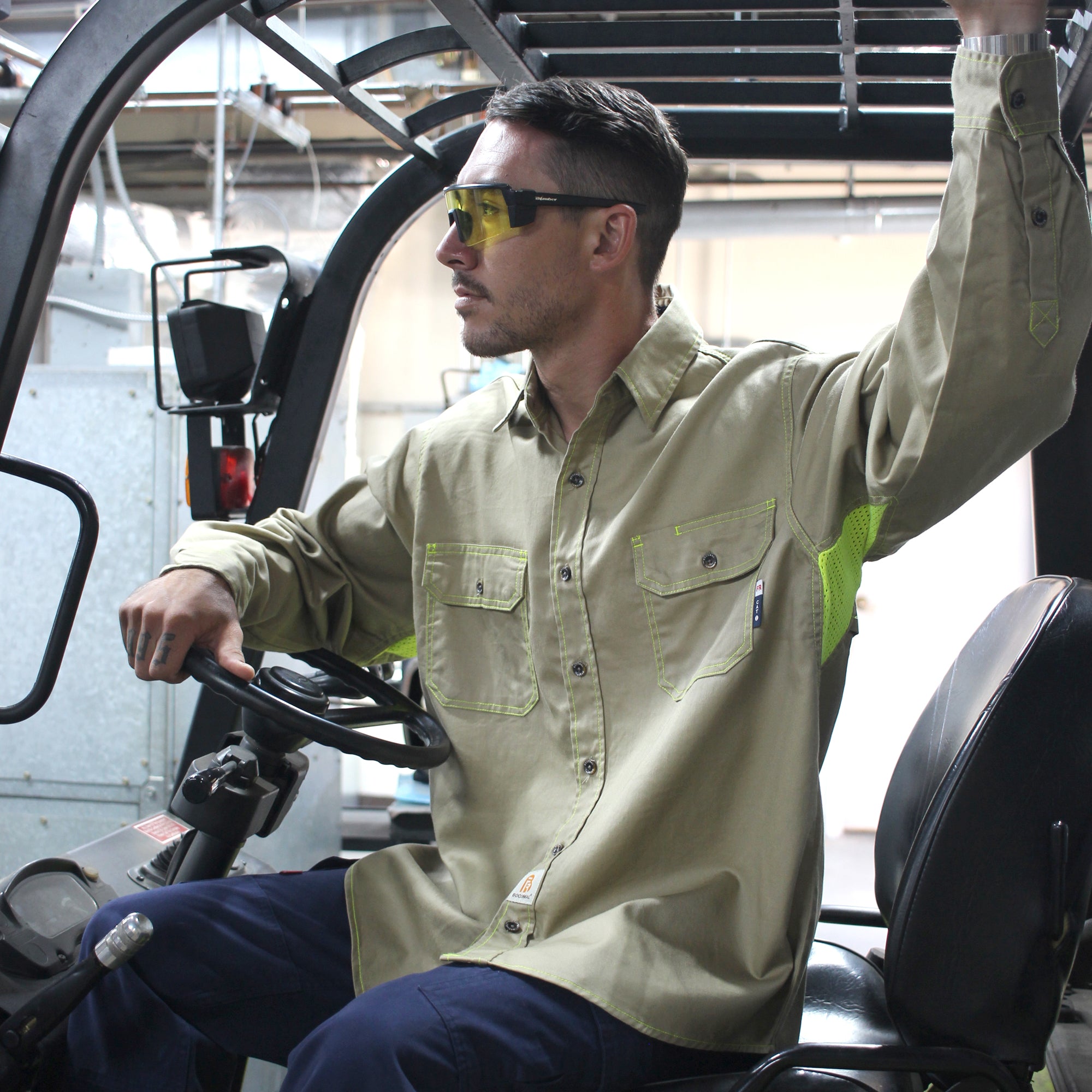 - This Men's Flame-Resistant summer work shirt is built for safety and comfort on the job. Designed with breathable Vented mesh panels under the arms and back(button closure) for a better experience, it keeps you cool during tough tasks on hot summer days. Made from lightweight 6.5 oz 100% cotton fabric, Modacrylic/Cotton Blend mesh, it offers reliable flame-resistant protection. The high-visibility yellow contrast mesh and stitching provide added safety in low-light conditions.
